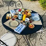 On sert le petit déjeuner dans le jardin chaque jour.